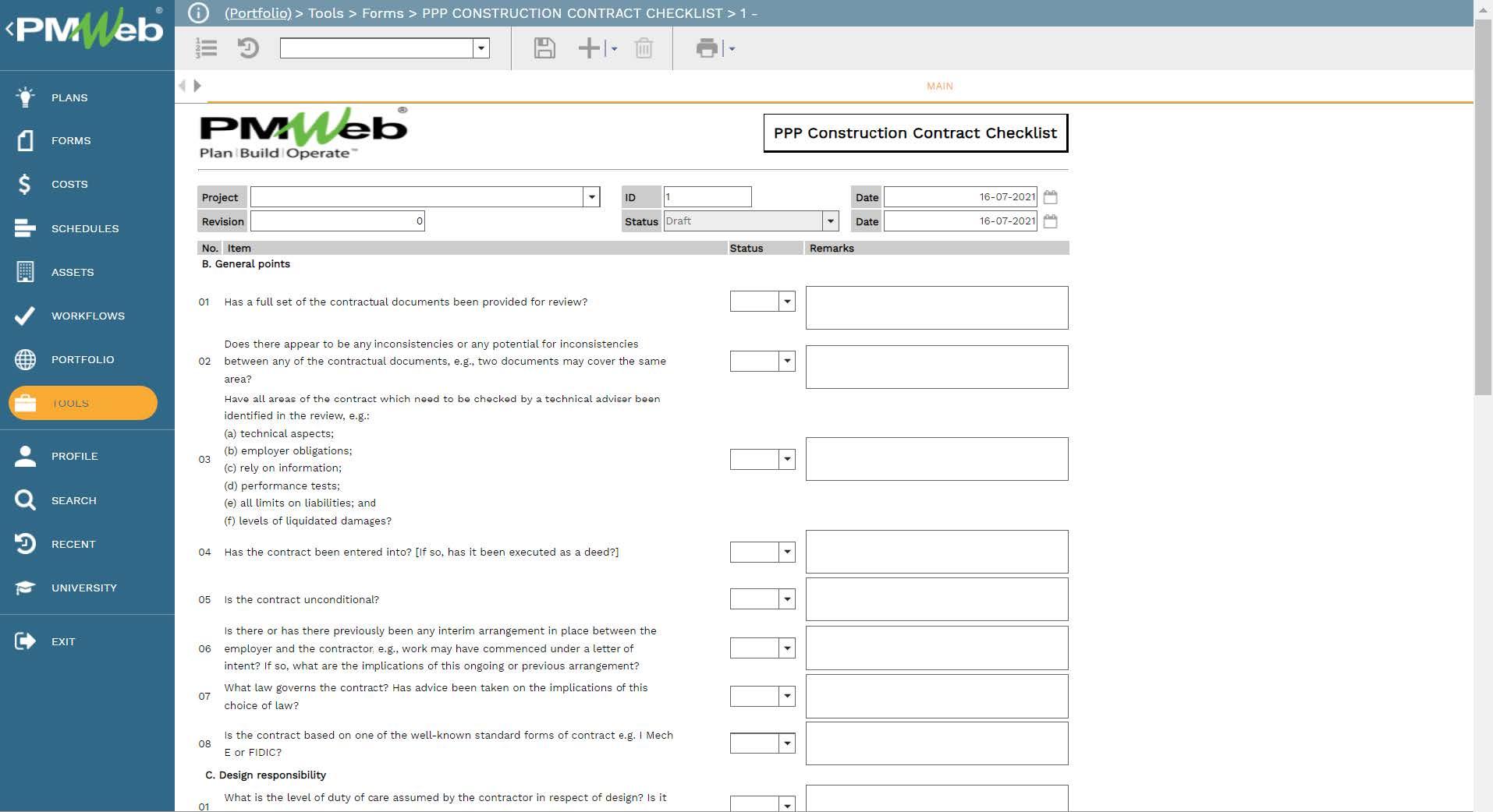 PMWeb visual custom form builder will be used to create the checklist. The checklist header will be used to capture all needed details of the PPP project. Nevertheless, the main body of the checklist will include all items to be reviewed for which there will be an option for stating whether it is compliance, not compliant, or not applicable. There is also a field to add remarks. The checklist will be grouped by the categories of the PPP checklist as well as the additional two sections that need to be reviewed.