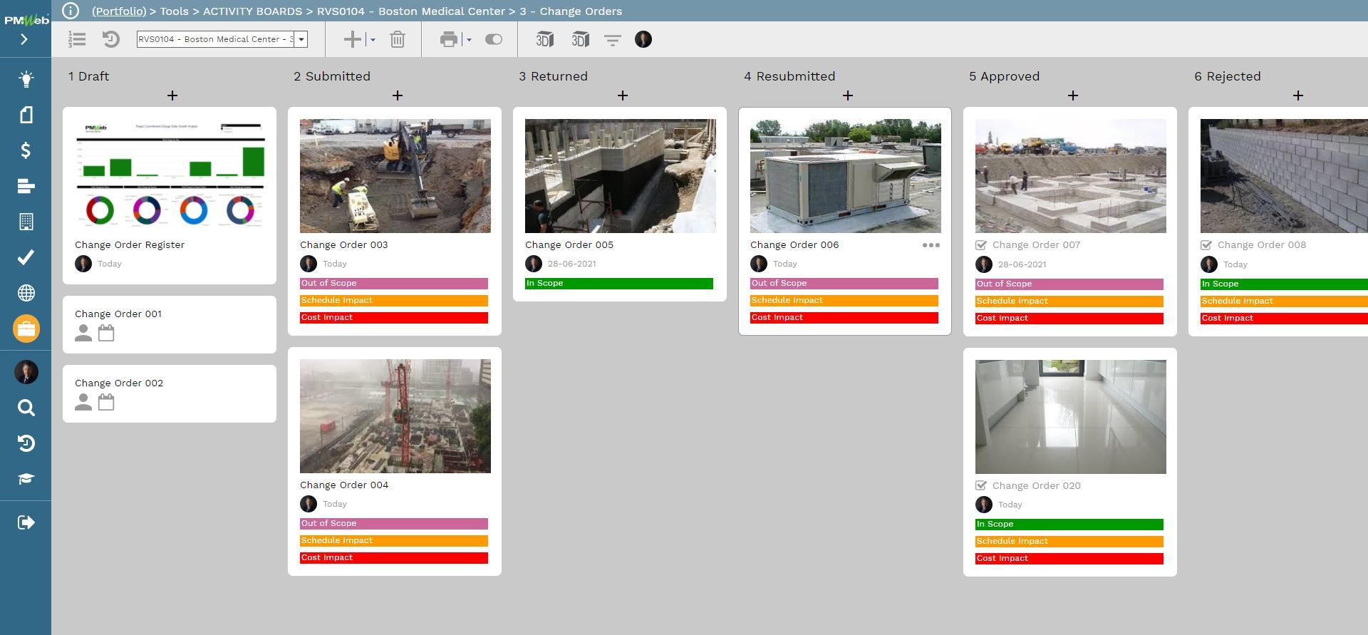 One of the key advantages of using a project management information system (PMIS) solution like PMWeb that enables managing all business processes required for a capital construction project delivery as well as has Kanban Activity Boards is the improved monitoring, evaluating, and reporting that will be achieved without scarifying the much-needed transparency and accountability. This will be possible by linking every task card or in this case change order with its relevant change order transaction managed in PMWeb. This will allow the Kanban Activity Board reader to drill down to the change order transaction managed in PMWeb to view all relevant details.