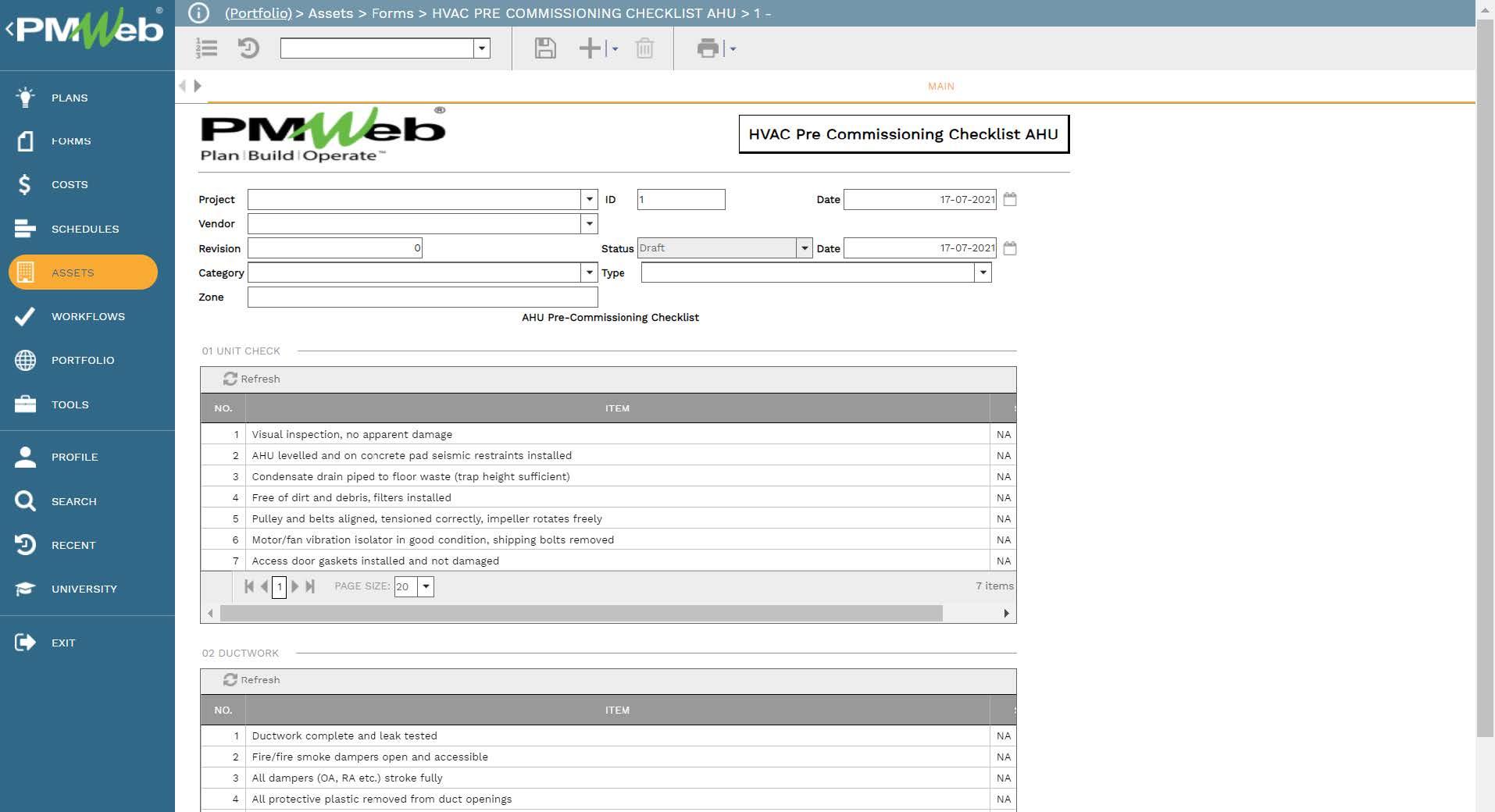 The pre-commissioning checklists are important to the commissioning process of a building as it allows for a smooth transition to the final testing and acceptance stage of the project. The pre-commissioning of the HVAC system ensures that the installation was done as per the contract design, identifies problems and resolve issues before the commencement of testing, provides an easier and cost-effective solution to remedy issues at the start of the project rather than during commissioning, and helps to provide an early resolution of problems thus reducing delays in commissioning and the overall project acceptance.Usually, there will be pre-commissioning checklists for Air Handling Units (AHU), Fan Coil Units (FCU), Pumps, Cooling towers, Heat Exchangers, Reheat Coils, Variable Air Volume (VAV) Units, Spilt Air Conditioning Units, and others. Using a Project Management Information System (PMIS) like PMWeb where all project management business processes including those for quality management will be the best platform to managing, monitor, evaluate and report on the status of all pre-commissioning checklists. PMWeb visual custom form builder will be used to create those templates for which there will be a separate template for each HVAC equipment and system. The Pre-Commissioning Checklist for the AHU header will include the AHU reference number, HVAC system or zone it belongs to, HVAC subcontractor or vendor name, date, and other details. It will include a detailed list of all items to be checked which will be grouped into their relevant categories.