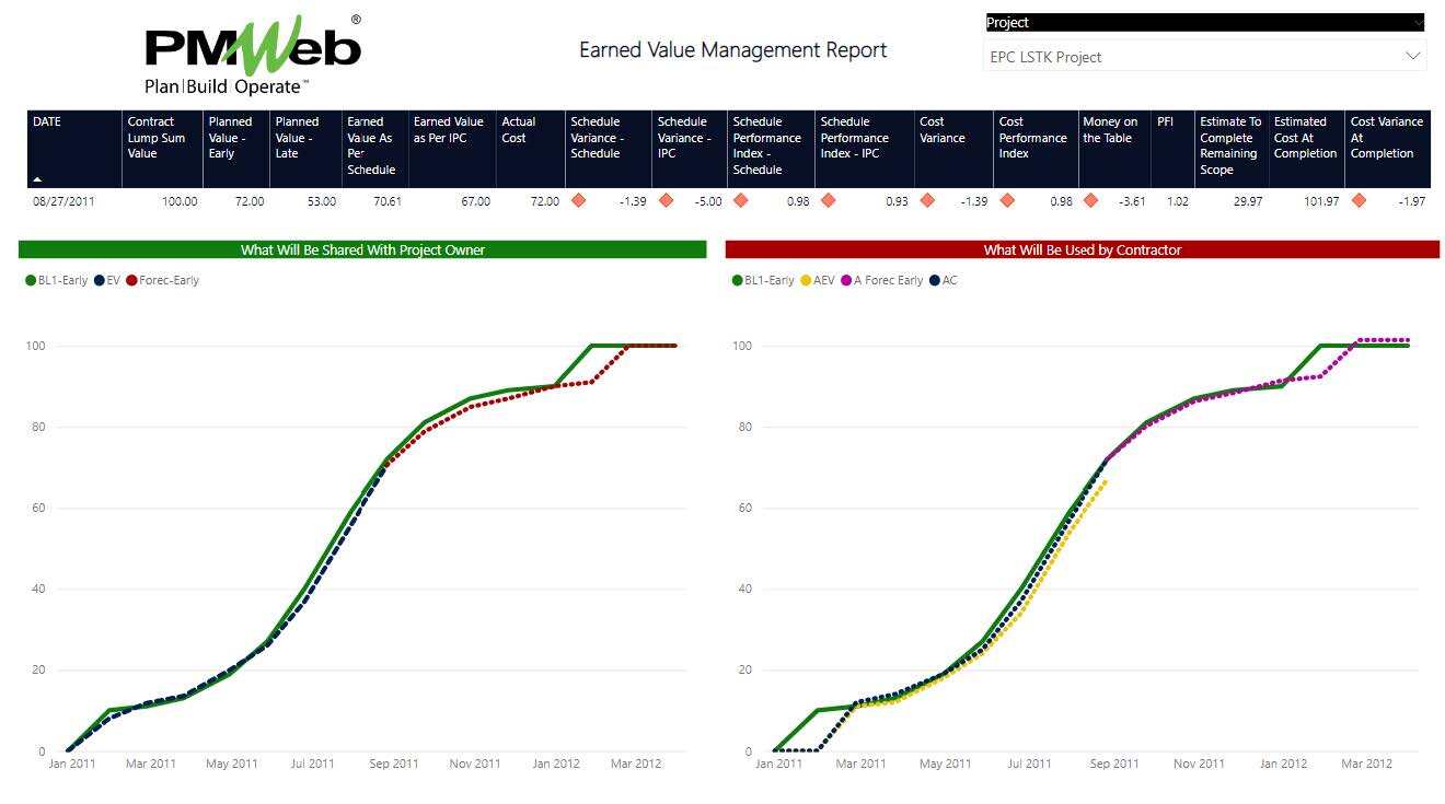 The EVM reporting will detail what will be shared with the Project Owner and will be used by the Contractor. The main difference between the two reports s that the one to be used by the Contractor will use the Earned Value (EV) as approved in the Interim Payment Certificate and the Actual Cost (AC) incurred in performing the same scope of work. The version to be shared with Project Owner will use the Earned Value (EV) calculated from the updated cost loaded schedule which will always equal the Actual Cost (AC) from a Project Owner perspective.