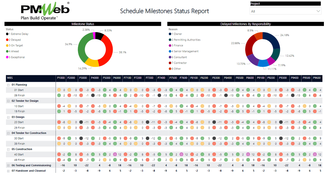Also, the report will include two donut visuals. The first is the display the percentage value of milestones by status. In contrast, the second donut will display the percentage value of delayed milestones (extreme delay and delayed) by reason for delay. The causes could include, for example, Project Owner, Permitting Authorities, Finance, Senior Management, Consultant, Contractor, and others.