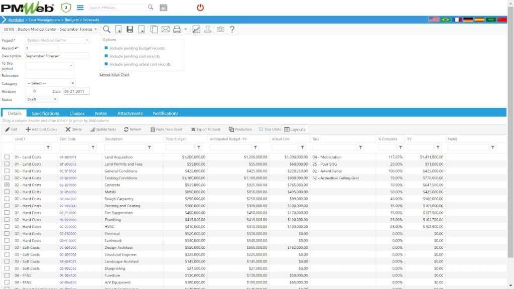 The project budget will reflect the approved transformed cost estimate where cost items will be summarized by their assigned cost breakdown structure. In addition, PMWeb allows creating the budget spending plan projection for each line item. Further, budget line items could have their cost in different currencies if needed. Similar to other PMWeb records, documents can be attached to the budget and workflow can be assigned to formally review and approve the budget.
