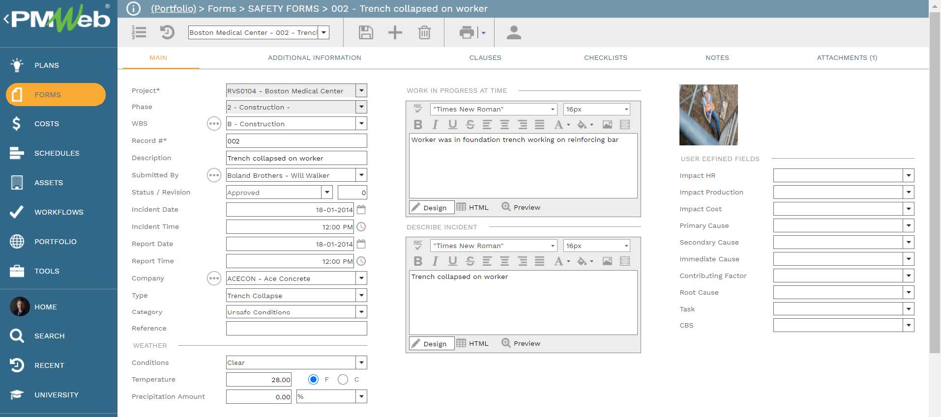 PMWeb 7 Forms Safety Forms Trench Collapsed on Worker Main