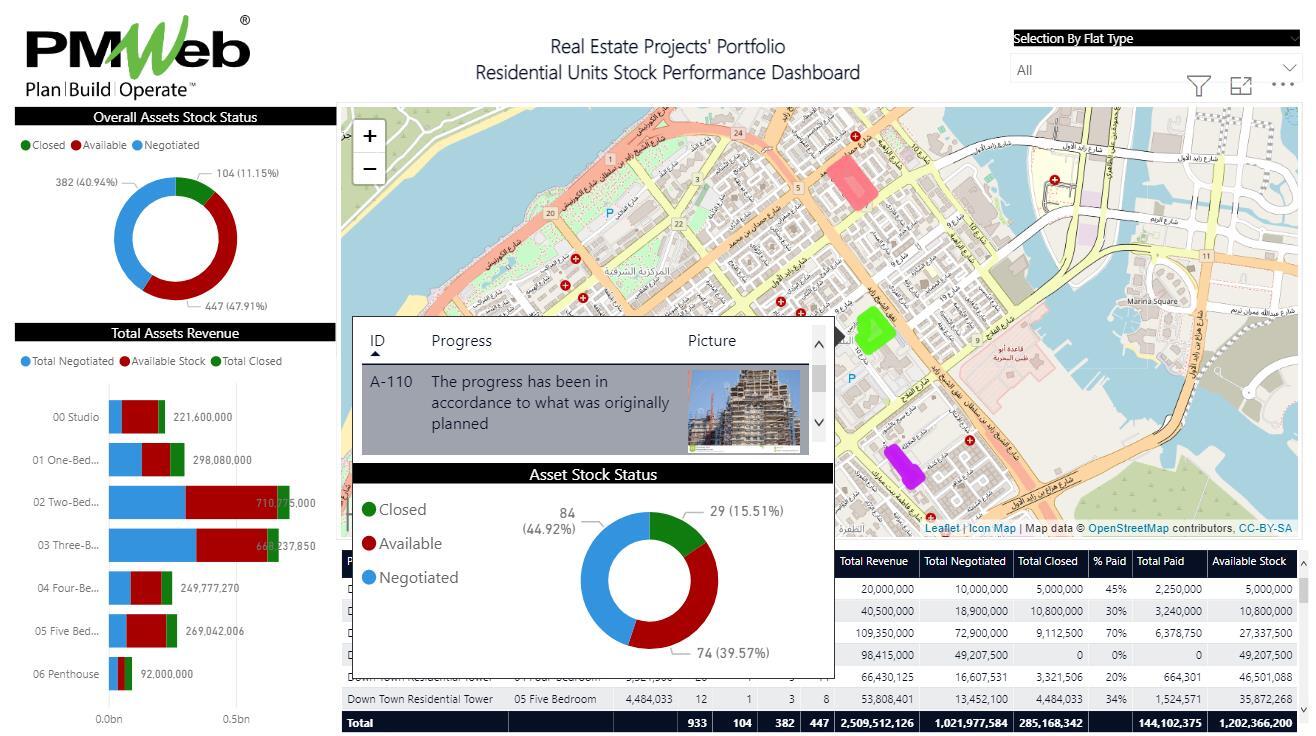 In addition, there could be a need to have details on the status of real estate assets inventory for single project development or across the complete real estate development projects’ portfolio. When reporting on the assets inventory, there might be a requirement to group, sort, compare and filter the generated information by certain data fields like asset size, price, buyer or occupant, and others. This information is also important for identifying purchase patterns and sales trends to provide a real-time single version of the truth of the whole projects’ portfolio as well as for a single project status of sales revenue tracking and performance breakdowns.The CRM and PMIS data create the real-time single version of the truth reports that each real estate developer requires. For example, a report could be created for each real estate development asset for which it also includes a visual for the project’s Building Information Modelling (BIM) model. The BIM model and associated data can export in a format that can be read, used, and visualized in MS Power BI using the “3DBI” visual developed by KG-DEV (https://kg-dev.be/). The BIM visual can help display the properties that were sold or closed, under negotiation and available.