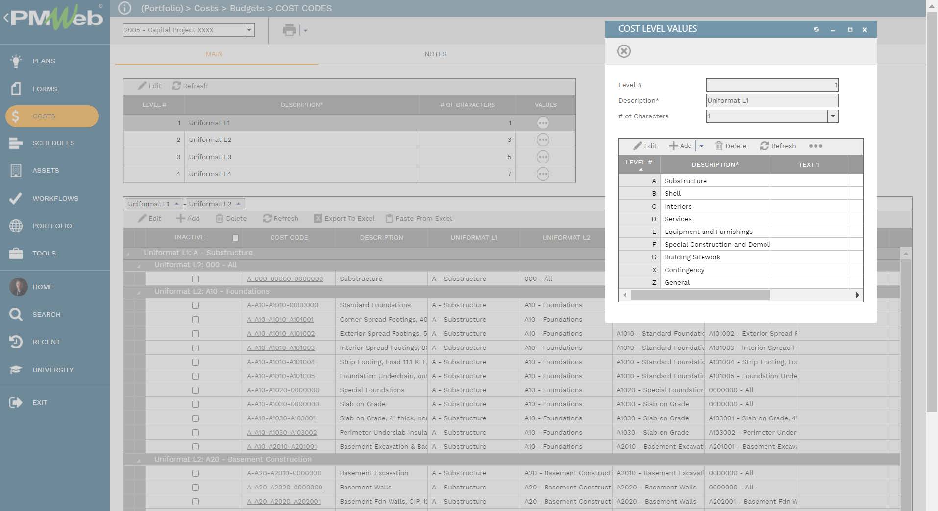 The next step is to decide on how the project cost will be monitored, controlled, and reported. This will be achieved by establishing the cost breakdown structure (CBS) levels which should be also aligned with the procurement buyout strategy set for the project. PMWeb allows defining a cost breakdown structure (CBS) of up to 16 levels with 10 digits per level. The same CBS levels will be also used for the resource and cost-loaded integrated project schedule control accounts. Those CBS levels will be assigned to the imported cost estimate line items.