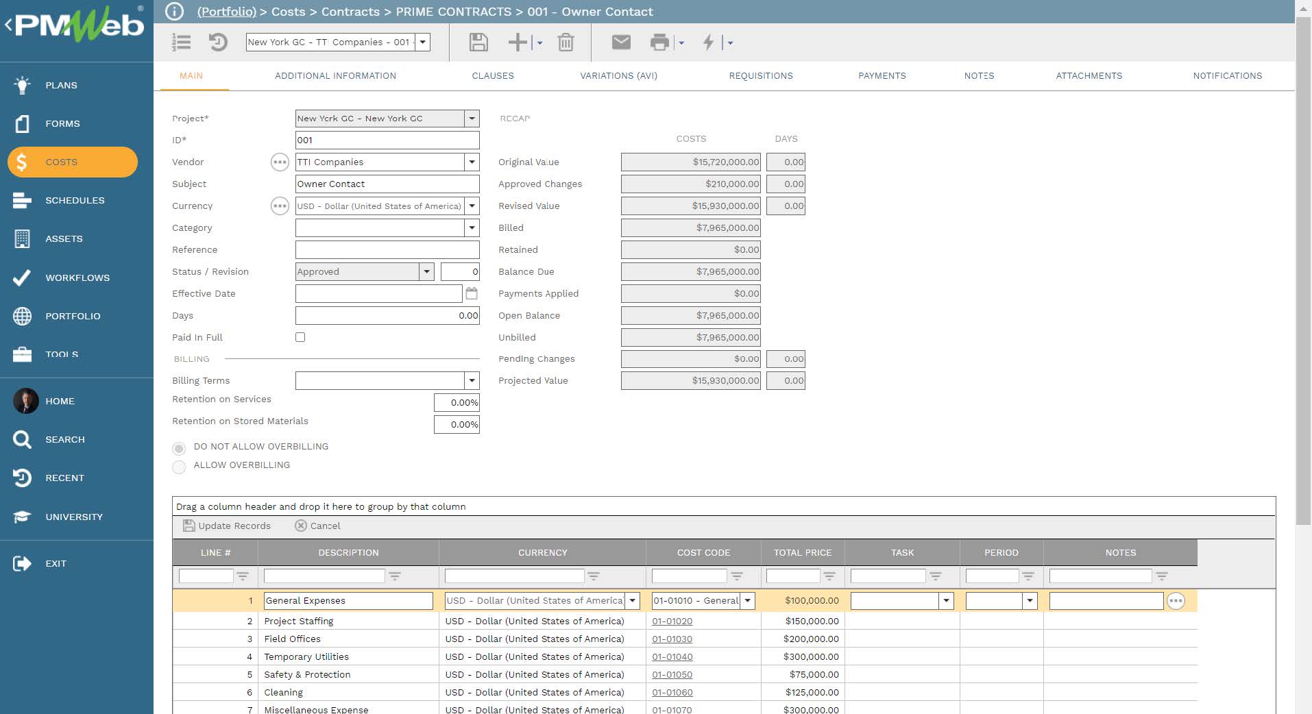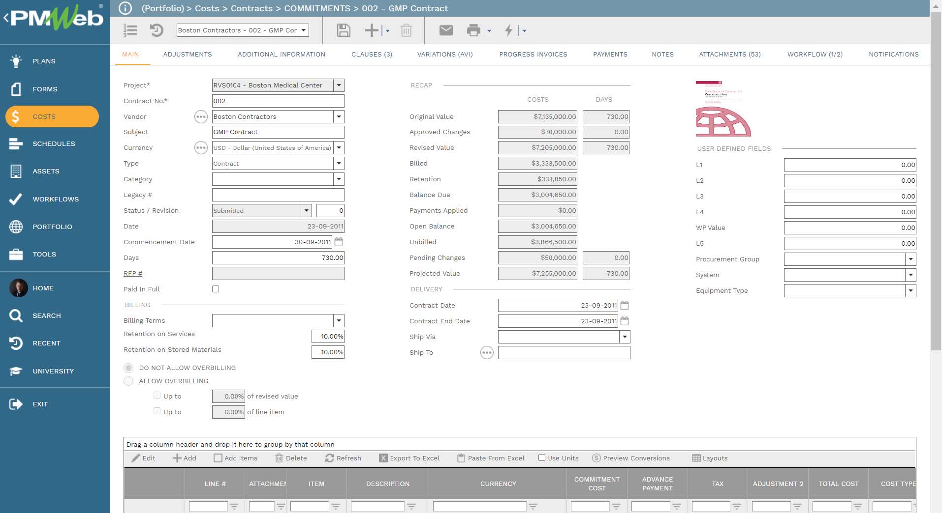 For each awarded commitment contract, all line items will be assigned their relevant cost breakdown structure (CBS) level. It should be noted that PMWeb allows adding lump sum as well as unit price commitment contracts. Similar to all other PMWeb cost records, commitment contracts could be of multi-currency at each line-item level.
