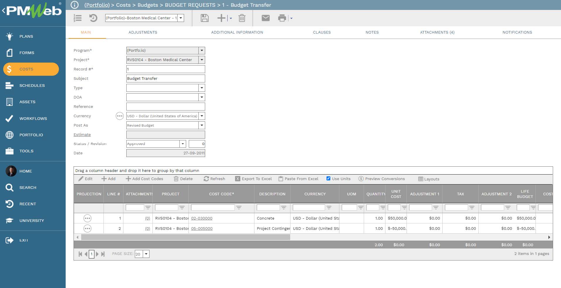 In the case there is a need to modify the values assigned to each budget line, the PMWeb budget request module provides the JV Contractor with a traceable and auditable process to track all those adjustments and transfers along with who have initiated, reviewed, and approved them. Those adjustments and transfers can be reported as Original Budget or Revised Budget values depending on how they need to be reported on. Similar to all other PMWeb cost records, budget requests could be of multi-currency at each line-item level.