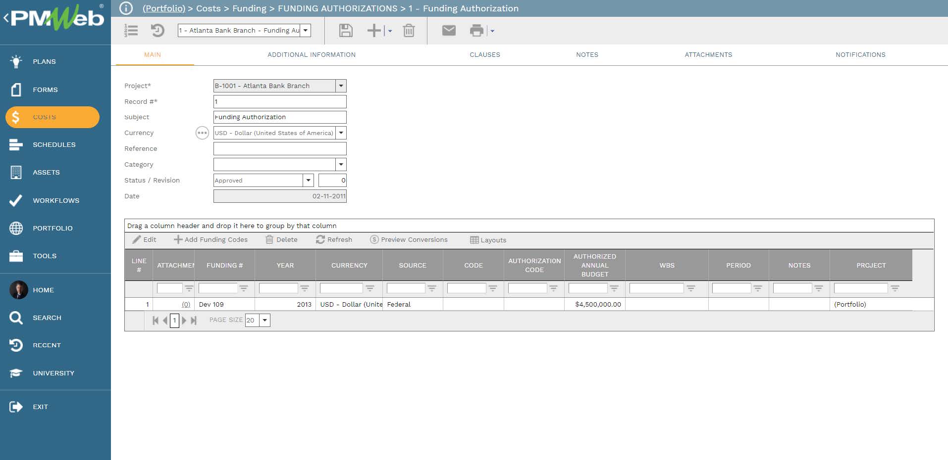 To ensure that the sources of funding for the project are formally captured and aligned with the approved baseline budget, PMWeb allows capturing the details of all authorized funding sources. Those could include the banks’ line of credit, bonds, guarantees, and overdraft facilities, funds provided by the contractors of the JV, and others. PMWeb allows assigning the sources of funding and amounts associated with each funding source to the budget line items.
