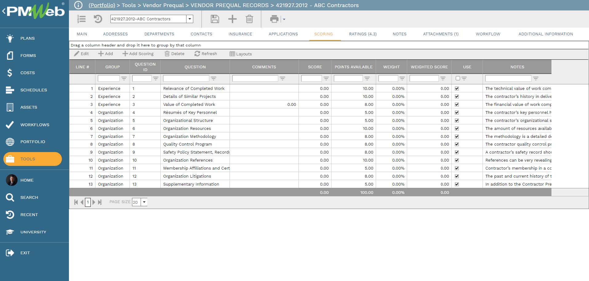 To ensure that the buyout process is successful and will achieve its objective, the first requirement is to ensure that the entities who will be considered as buyers for the project scope of work are qualified to do so. Otherwise, the JV Contractor will be increasing their project’s risk rather than mitigating it. Therefore, the PMWeb vendor prequalification module will be used to create the prequalification documents as well as enforce a formal process for assessing and scoring the prequalification submissions of those entities.