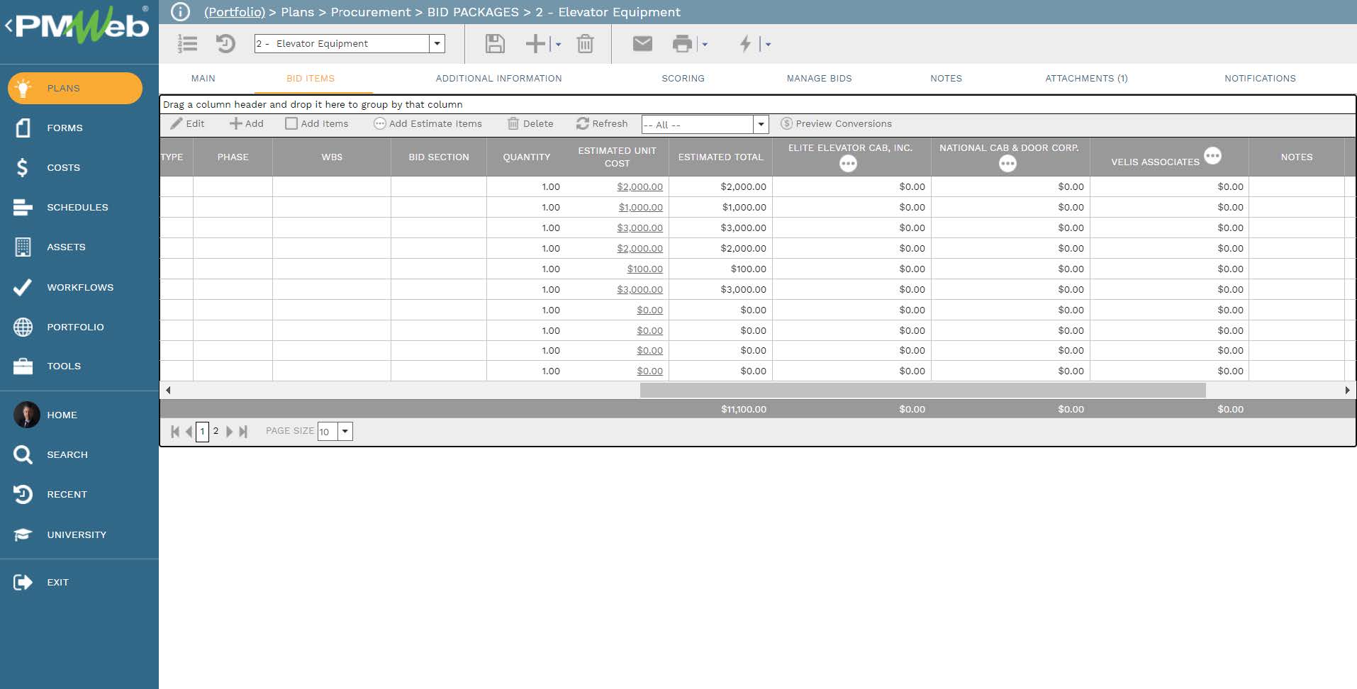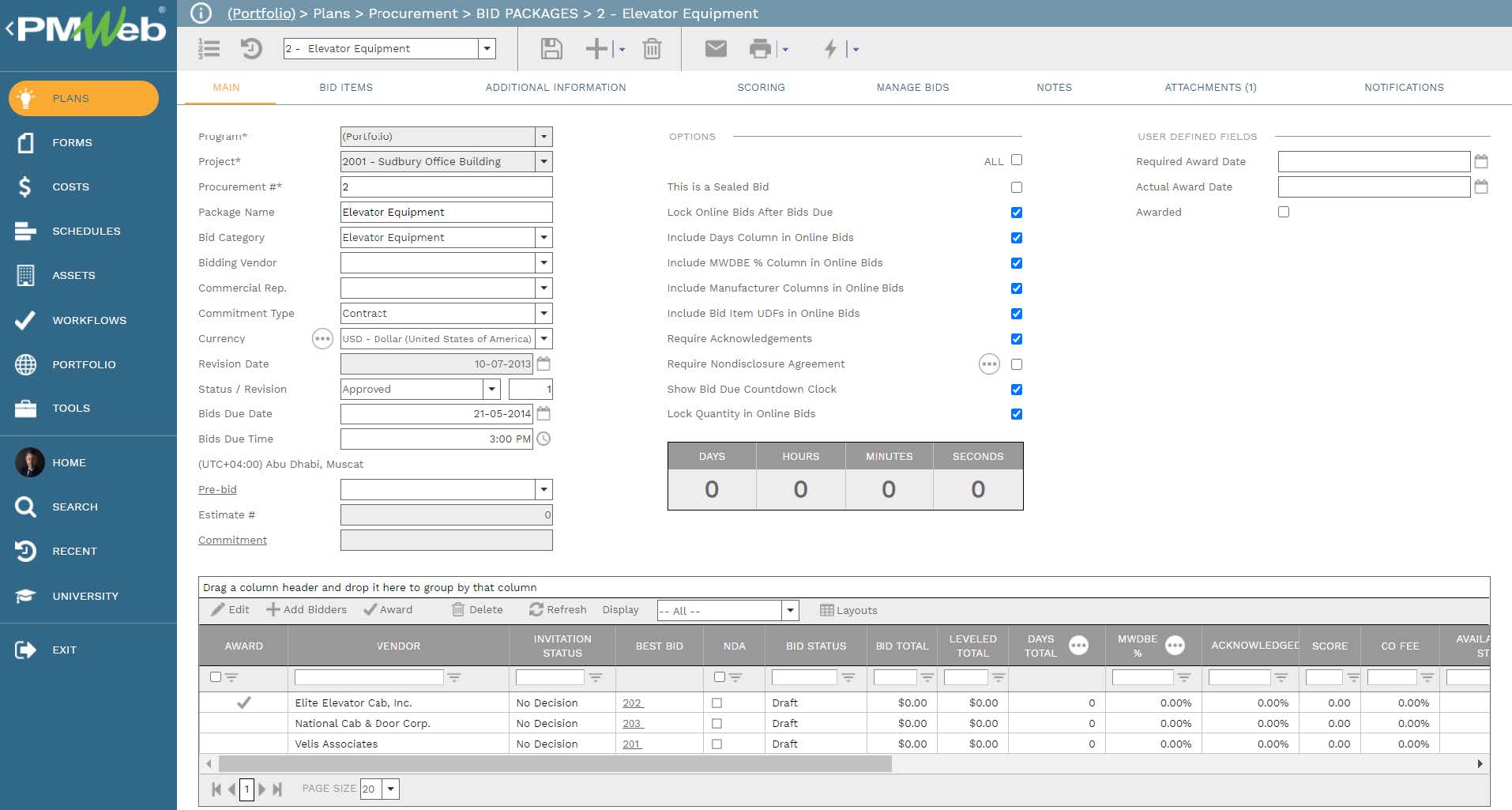 The next step is to formalize the process for procuring the buyout’s scope of work. PMWeb procurement module will be used to define the work packages to be procured. Those will be automatically generated from the approved cost estimate module using the bid package identification provided in the field for “Work Package” for each line in the cost estimate. The bidders for each bid package will be selected from the PMWeb Vendors module which will have the details of all registered and qualified bidders. For each bid package, PMWeb will allow defining when the bids will be due for submission.