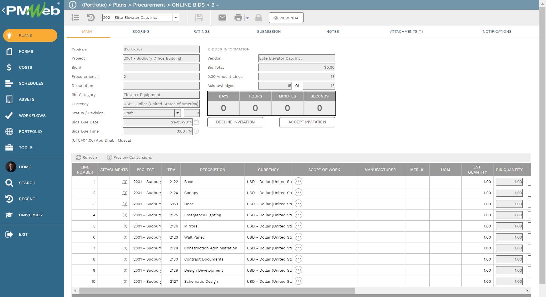 An invitation to bid will be issued from the PMWeb procurement module using the Notification option to all qualified bidders. Each invited bidder will receive an email with the link to PMWeb online bid module. This will be the module where each bidder will complete and submit technical and commercial requirements set for the bid package. Those bidders will attach all supportive documents requested by the JV Contractor.