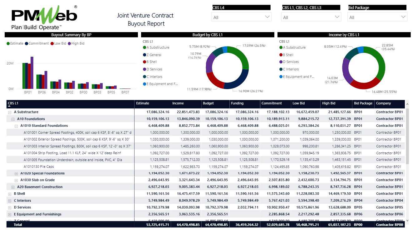 The trustworthy data captured in the different PMWeb modules by their accountable team member which are detailed above will become the basis for generating a real-time single version of the truth report on the project’s buyout. The report will include a cost table that is structured by the Cost Breakdown Structure (CBS) levels. For each level, the values for the approved cost estimate, income contract which is the contract between the JV Contractor and Project Owner, budget, funding, awarded commitment contract, low and high bids value, bid package number or contract number, and awarded subcontractor, supplier, or any buyer name.The report will also include a histogram visual to summarize the estimated, awarded, low, and high bid values for each bid package as well as two donut visuals to summarize the breakdown of project budget and income contract by the first level of the cost breakdown structure (CBS). In addition, the report includes filters to select specific bid package or packages as well as any cost breakdown structure (CBS) value at any CBS level.