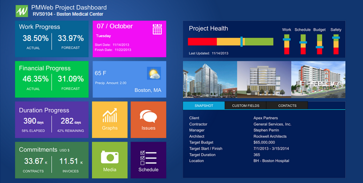 Many of those reports and dashboards will be created using the PMWeb Business Intelligence reporting tool. Those dashboards can be designed to allow the reader to drill down to the level of the specific business process that was the basis for the reported information. For example, from the financial progress card, the reader can drill down to the cost report where it details the project’s estimate, budget, income contract, and commitment contracts details including the original value, changes, revised value, pending changes, projected value, earned and actual cost to date. The cost report will be grouped by the cost breakdown structure (CBS) levels to enable the reader to drill down to more detailed CBS levels when needed. The same would apply to other project management aspects covered in the performance dashboard.
