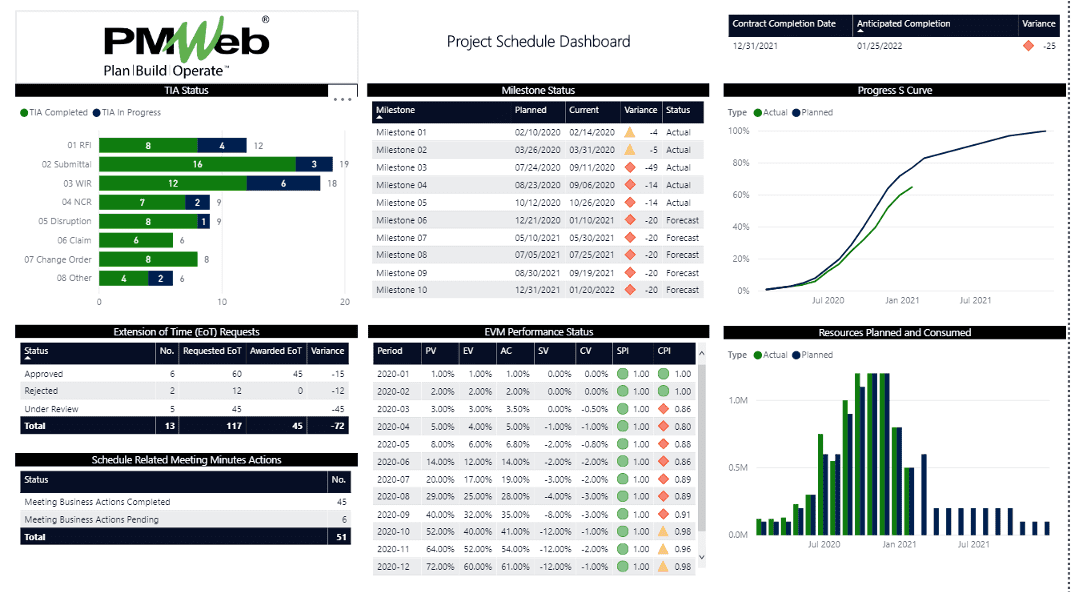 In addition, PMWeb, a custom form builder, can also implement the planning and scheduling engineers’ processes for performing. For example, those include Time Impact Analysis (TIA), Extension of Time (EOT) Requests, Update Schedule Narrative Report, among others. By using PMWeb to manage those processes and capture their relevant data, the planning and scheduling engineers can create reports to monitor, evaluate and report on the performance of those processes.