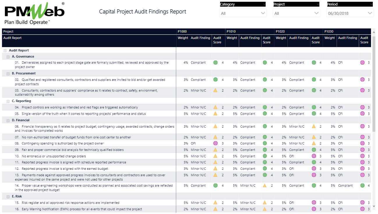 For example, under the financial category, the items that need to be audited might include financial transparency as it relates to project budget, contingency usage, awarded contracts, change orders, and invoices for completed works; No non-authorized transfer of budget funds from one cost center to another; Contingency spending is authorized by the project owner; Fair and proper commercial bid analysis for technically qualified bidders; No erroneous or unsupported change orders; Reported progress invoice is aligned with schedule reported performance; Reported progress invoice is aligned with the earned budget; Payments made against approved progress invoices to consultants and contractors are used to cover expenses incurred on the same project and were not used for other projects, and proper value engineering workshops were conducted as planned and associated cost savings are reflected in the approved project budget. Each one of those audit objectives has a weighted value so the total of all audit objectives is 100%.For each audit item, the internal auditor needs to report the audit findings which could be compliant, opportunities for improvement (OFI), minor non-compliances, and major non-compliances. Those findings are scored on a scale of 4 where being compliant has a score of 4 points (Green) while major non-compliances scores 1 point (Red). The score for opportunities for improvement (OFI) is 3 points (Purple), and minor non-compliances scores 2 points (Yellow).
