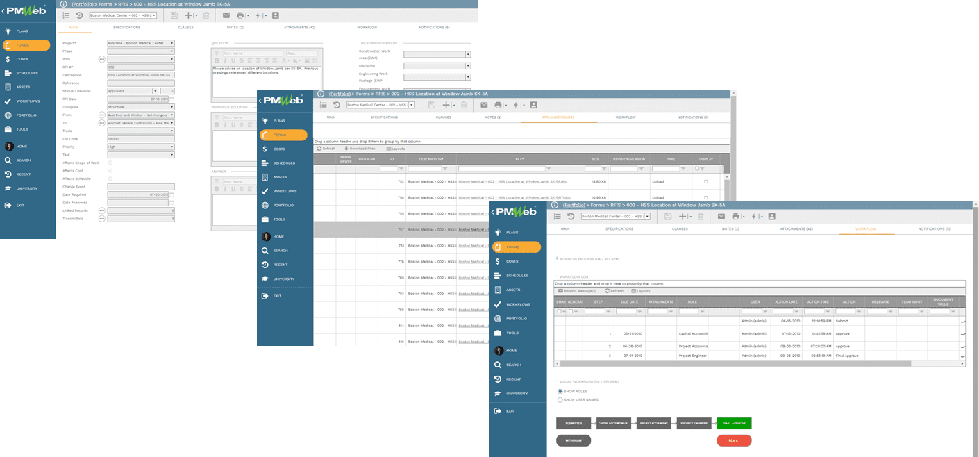 One of those Project Management Information System (PMIS) solutions is PMWeb, which comes ready with many of the processes needed to manage capital construction projects. This construction project management software features a custom form builder that allows the creation of all other needed processes. For each process transaction, supportive documents and links to relevant records and imported MS Outlook email can be added. To enforce accountability and map the execution responsibilities for each process in accordance with the project’s Responsibility Assignment Matrix (RAM), workflows to identify the tasks needed to submit, review, support, inform, approve, or reject a transaction of each project management process needs to be created. Workflow steps identify the duration for each step and the sequence for performing them. Further, rules need to be added to the workflow to enforce the project’s approval authority levels. Those workflow steps can be also linked to DocuSign to enable the use of digital signatures.