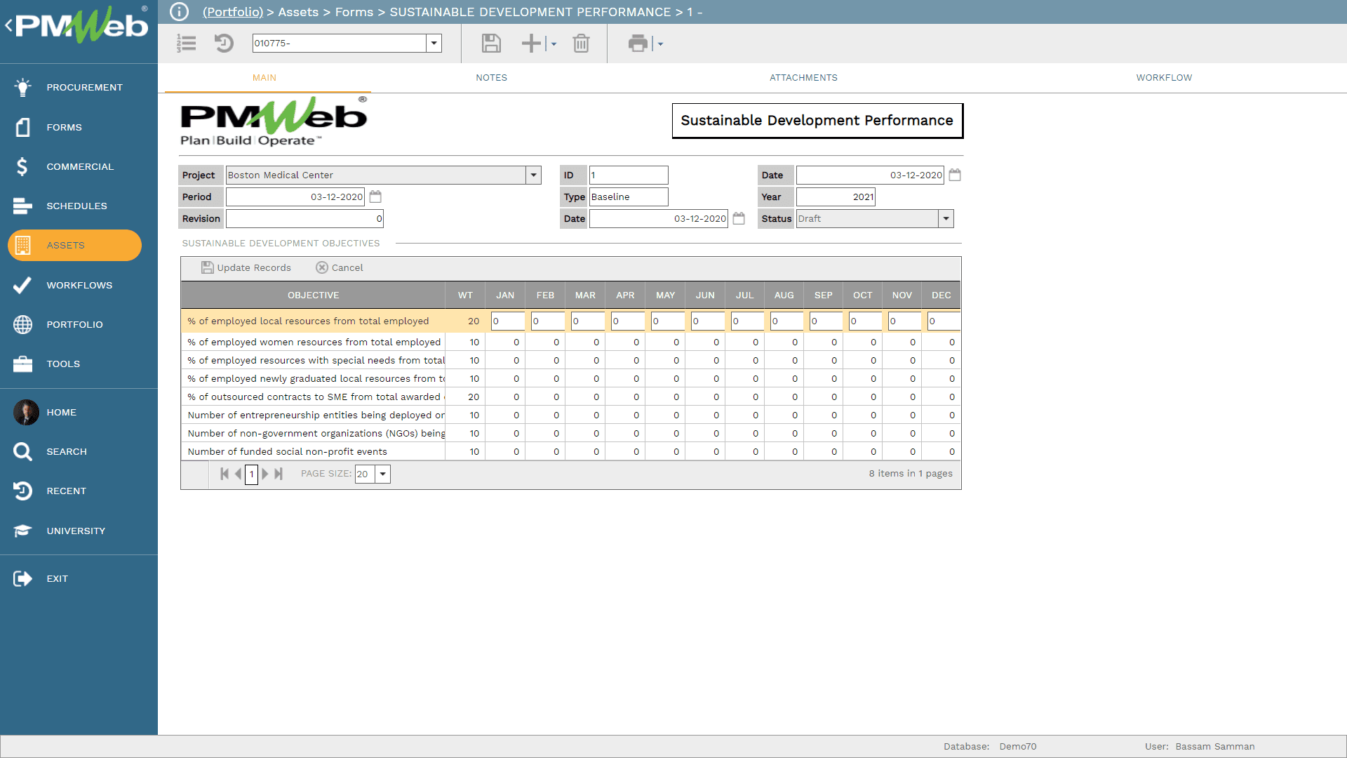 Using a Project Management Information System (PMIS) like PMWeb, managing, monitoring, evaluating, and reporting sustainable development performance will be achieved. PMWeb custom form builder will be used to create the input form needed to ensure transparency and accountability in reporting the sustainable development performance. The form will be designed to allow capturing the baseline and actual achievement of the sustainable development objectives for each year and each month within the year.